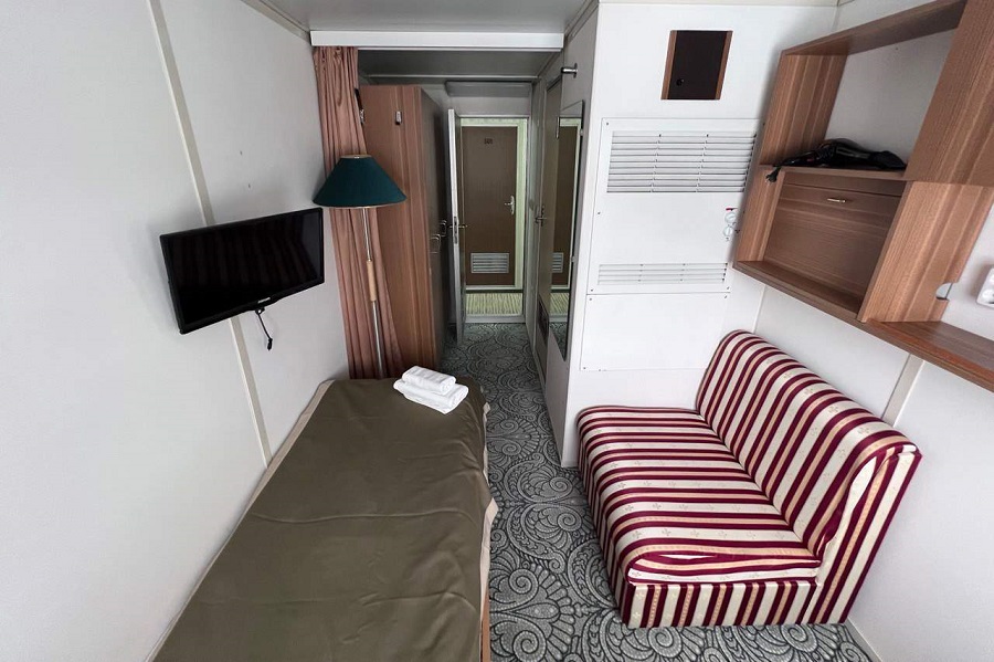 | Солнечная палуба | 1-местная (солнечная палуба) К категории 1-местная (солнечная палуба) относятся каюты: 501–504.Одноместная каюта со всеми удобствами, расположенная на солнечной палубе. Площадь каюты ≈ 8,4 м². Доступ к Wi-Fi предоставляется с ограничением трафика. В каюте: односпальная кровать, кресло, кондиционер/обогреватель, телевизор, сейф, внутренний телефон, фен, стеклянные стаканы для питья, щетка для одежды, обзорное окно.В ванной комнате: душ, зеркало, 2 стакана, туалетные принадлежности (мыло, шампунь, гель для душа, туалетная бумага), комплект полотенец (полотенце банное большое, полотенце для рук среднее). | 1-местное размещение | нет |