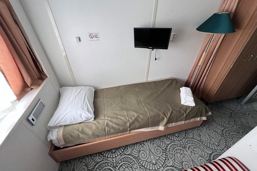 | Шлюпочная палуба | 1-местная (шлюпочная палуба) К категории 1-местная (шлюпочная палуба) относятся каюты: 419–426.Одноместная каюта со всеми удобствами, расположенная на шлюпочной палубе. Площадь каюты ≈ 6 м². Доступ к Wi-Fi предоставляется с ограничением трафика. В каюте: односпальная кровать, кондиционер/обогреватель, телевизор, сейф, внутренний телефон, фен, стеклянные стаканы для питья, щетка для одежды, обзорное окно.В ванной комнате: душ, зеркало, 2 стакана, туалетные принадлежности (мыло, шампунь, гель для душа, туалетная бумага), комплект полотенец (полотенце банное большое, полотенце для рук среднее). | 1-местное размещение | нет |