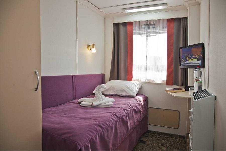 Шлюпочная палуба | 1-местная (шлюпочная палуба) К категории 1-местная (шлюпочная палуба) относятся каюты: 419–426.Одноместная каюта со всеми удобствами, расположенная на шлюпочной палубе. Площадь каюты ≈ 6 м². Доступ к Wi-Fi предоставляется с ограничением трафика. В каюте: односпальная кровать, кондиционер/обогреватель, телевизор, сейф, внутренний телефон, фен, стеклянные стаканы для питья, щетка для одежды, обзорное окно.В ванной комнате: душ, зеркало, 2 стакана, туалетные принадлежности (мыло, шампунь, гель для душа, туалетная бумага), комплект полотенец (полотенце банное большое, полотенце для рук среднее). | 1-местное размещение | нет |