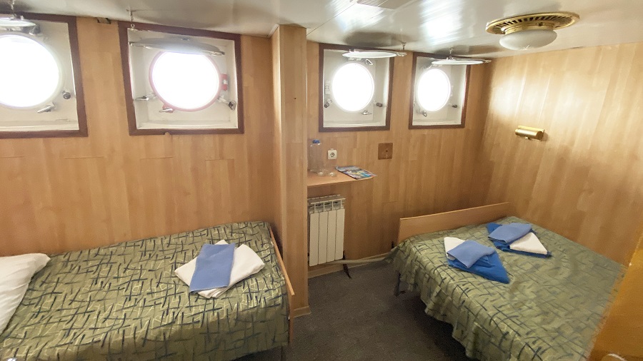 | Средняя палуба | Омега фронт К категории Омега фронт относятся каюты: 303–308, 310–313, 315, 317, 319–330.Двухъярусная двухместная каюта со всеми удобствами, расположенная на средней палубе.Площадь каюты ≈ 7 м². Возможно размещение третьего человека на дополнительном месте верхнего расположения. В каюте: две односпальные кровати и одно спальное место верхнего расположения, ванная комната (раковина, душ, туалет), кондиционер, шкаф для одежды, стол, мини-холодильник, радио, розетка 220V, обзорное окно. | 2-местное размещение | нет |