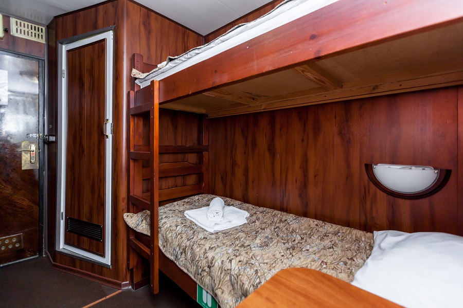 | Главная палуба | 2Б К категории 2Б относятся каюты: 41–44.Двухместная двухъярусная каюта со всеми удобствами, расположенная на главной палубе.В каюте: двухъярусная кровать, ванная комната (раковина, душ, туалет), холодильник, обзорное окно. | 2-местное размещение | ✔ |