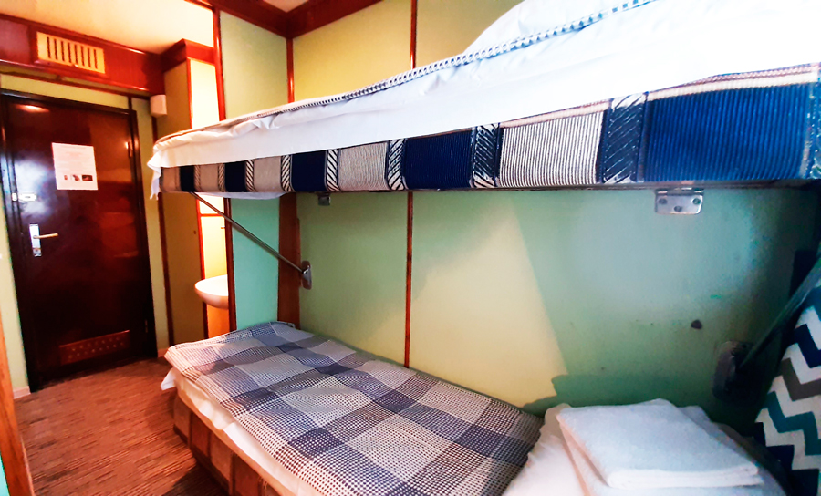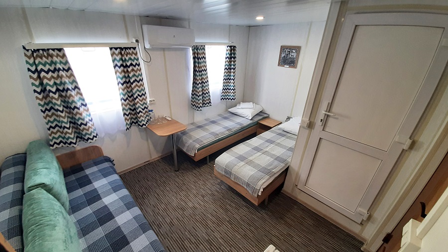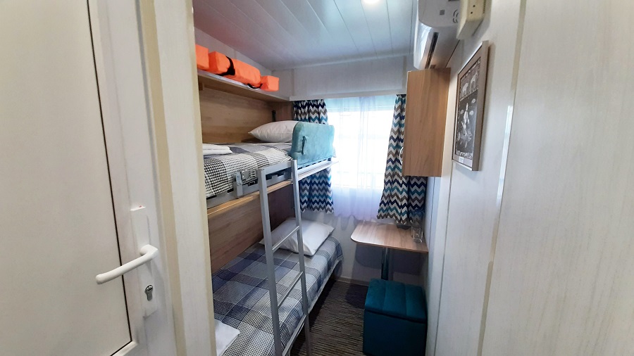 Нижняя палуба | Бета (4) К категории Бета (4) относятся каюты: 003–008.Четырехместная двухъярусная каюта со всеми удобствами, расположенная на нижней палубе.Площадь каюты от 8 до 8,5 м². Возможно двухместное и трехместное размещение в каюте. В каюте: две односпальных кровати и два спальных места верхнего расположения, ванная комната (раковина, душ, туалет), иллюминаторы. | 4-местное размещение | ✔ |