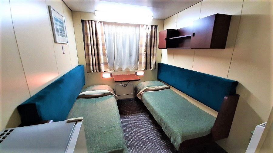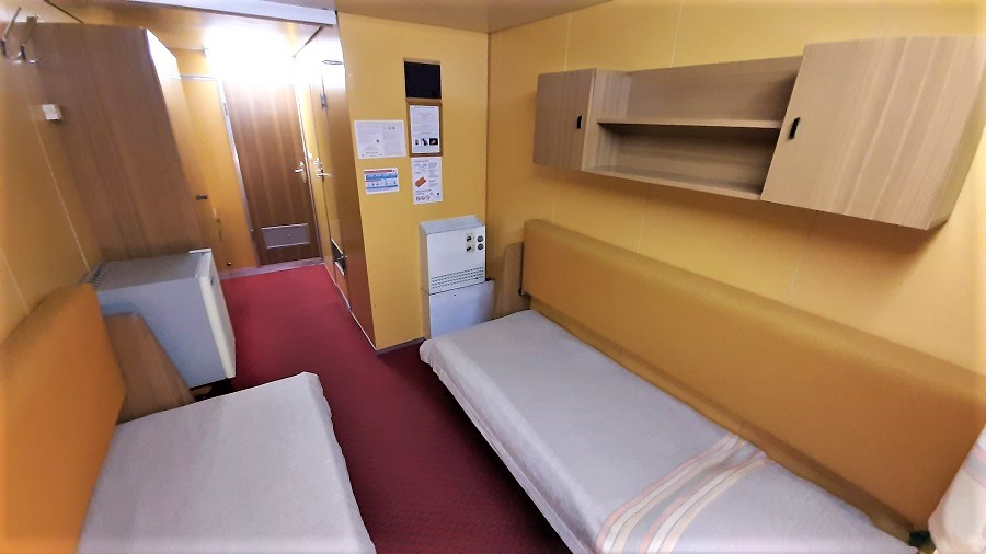 | Шлюпочная палуба | Сигма К категории Сигма относятся каюты: 317, 318, 355–366, 401, 402.Двухместная двухъярусная каюта со всеми удобствами, расположенная на средней и шлюпочной палубах.Площадь от 6,5 до 7,5 м². В каютах 355-360 доступно только двухместное размещение. В каюте: два спальных места (одно над другим), ванная комната (раковина, душ, туалет), шкаф для одежды, кондиционер, холодильник, радио, розетка 220 V, обзорное окно. | 2-местное размещение | нет |