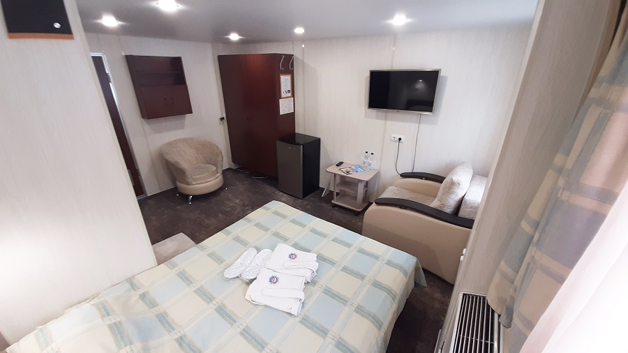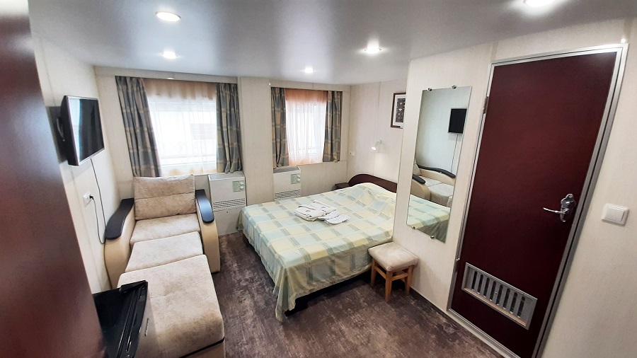 | Средняя палуба | Полулюкс К категории Полулюкс относятся каюты: 302, 306, 309, 310, 313, 314.Двухместная каюта со всеми удобствами, расположенная на средней палубе.Площадь каюты ≈ 13 м². Возможно размещение третьего человека на дополнительном спальном месте – кресло-кровать (60х190 см). В каюте: двуспальная кровать, кресло-кровать, ванная комната (раковина, душ, туалет), шкаф для одежды, кондиционер, холодильник, спутниковое ТВ, радио, розетка 220 V, два обзорных окна. | 2-местное размещение | нет |