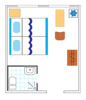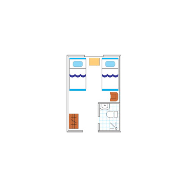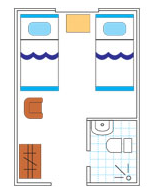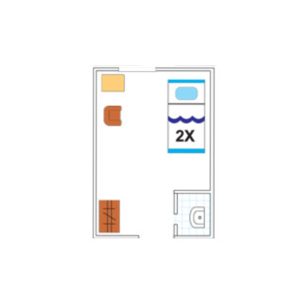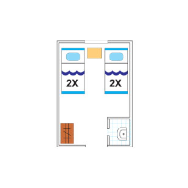 | Нижняя палуба | А2н К категории А2н относятся каюты: 001, 003, 004, 009–012.Двухместная каюта со всеми удобствами, расположенная на нижней палубе. В каютах 009–012 возможно размещение третьего человека на дополнительном спальном месте. В каюте: две односпальные кровати, ванная комната (раковина, душ, туалет), радио, холодильник, стол, стул, шкаф для одежды, розетка 220 V, иллюминаторы. | 2-местное размещение | ✔ |