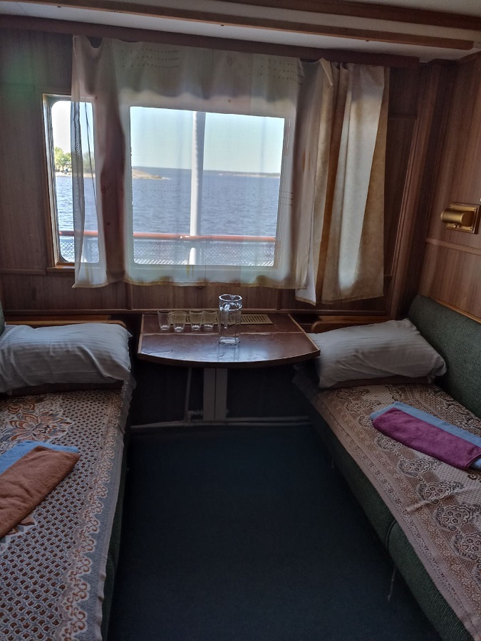 | Средняя палуба | Полулюкс К категории Полулюкс относятся каюты: 101, 102, 233, В.Двухместная каюта со всеми удобствами, расположенная на главной, средней и шлюпочной палубах. В каютах 101, 102, 233, В – размещение только для семейных пар, либо один из родителей с ребенком до 10 лет (включительно). В каюте: двуспальная кровать, ванная комната (раковина, душ, туалет), радио, холодильник, стол, стул, шкаф для одежды, розетка 220 V, обзорное окно. | 2-местное размещение | нет |