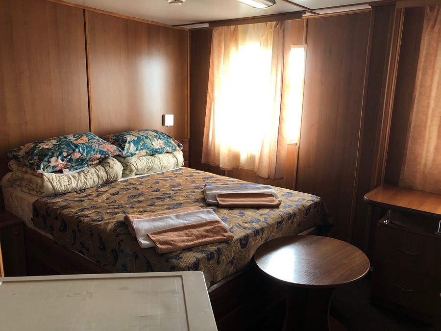 | Главная палуба | Полулюкс К категории Полулюкс относятся каюты: 101, 102, 233, В.Двухместная каюта со всеми удобствами, расположенная на главной, средней и шлюпочной палубах. В каютах 101, 102, 233, В – размещение только для семейных пар, либо один из родителей с ребенком до 10 лет (включительно). В каюте: двуспальная кровать, ванная комната (раковина, душ, туалет), радио, холодильник, стол, стул, шкаф для одежды, розетка 220 V, обзорное окно. | 2-местное размещение | ✔ |
