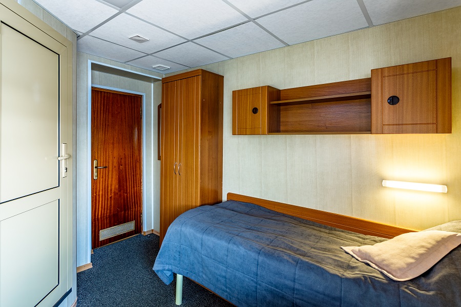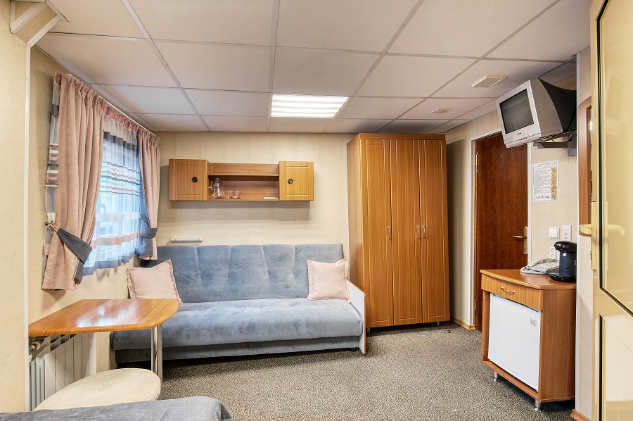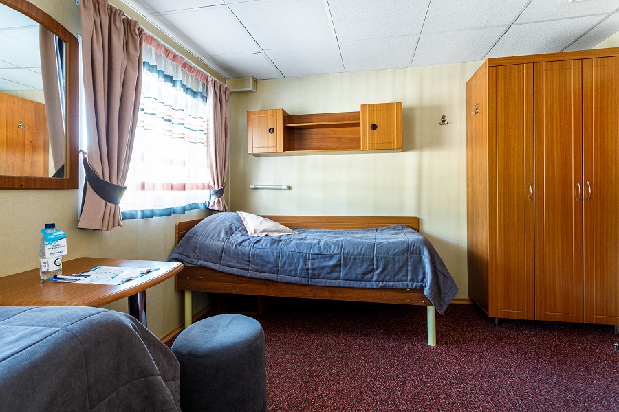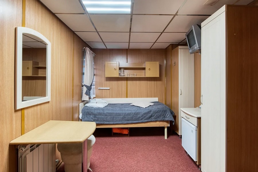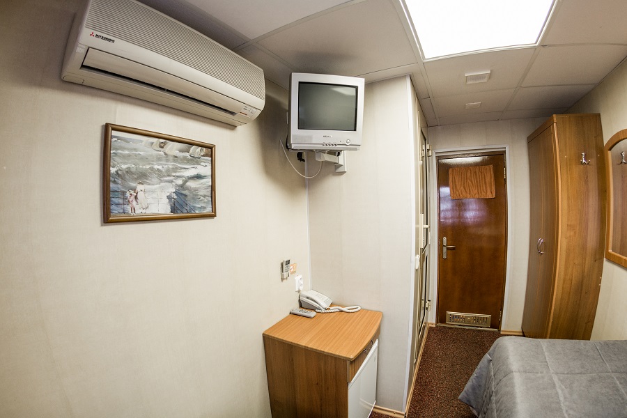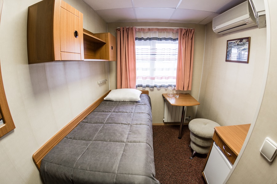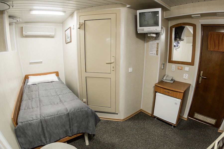Средняя палуба | А1(I) К категории А1(I) относятся каюты: 201, 202, 207, 208, 313. Одноместные каюты со всеми удобствами, расположенные на средней и главной палубах. Площадь каюты от 7 до 12,3 м².В каюте: односпальная кровать, ванная комната (раковина, душевая кабина, туалет), шкаф, тумба, пуф, стол, настенная полка, телевизор с кабельным и спутниковым вещанием, холодильник, кондиционер, телефон внутренней связи, розетки 220 V, радио, фен, плед, щетка для одежды, обзорное окно. | 1-местное размещение | нет |