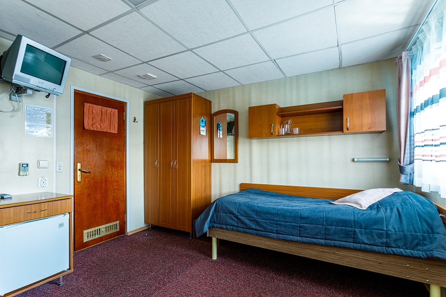 Главная палуба | А1(I) К категории А1(I) относятся каюты: 201, 202, 207, 208, 313. Одноместные каюты со всеми удобствами, расположенные на средней и главной палубах. Площадь каюты от 7 до 12,3 м².В каюте: односпальная кровать, ванная комната (раковина, душевая кабина, туалет), шкаф, тумба, пуф, стол, настенная полка, телевизор с кабельным и спутниковым вещанием, холодильник, кондиционер, телефон внутренней связи, розетки 220 V, радио, фен, плед, щетка для одежды, обзорное окно. | 1-местное размещение | нет |