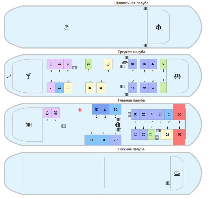| Средняя палуба | Омега (2+1) К категории Омега (2+1) относятся каюты: 17, 18, 40.Двухместные каюты со всеми удобствами, расположенные на главной и средней палубах.Площадь каюты от 7,2 до 7,9 м². Возможно размещение третьего человека на дополнительном спальном месте верхнего расположения. В каюте: две односпальные кровати и одно спальное место верхнего расположения, ванная комната (раковина, душ, туалет), холодильник, кондиционирование, радио, розетка 220V, обзорное окно. | 3-местное размещение | ✔ |