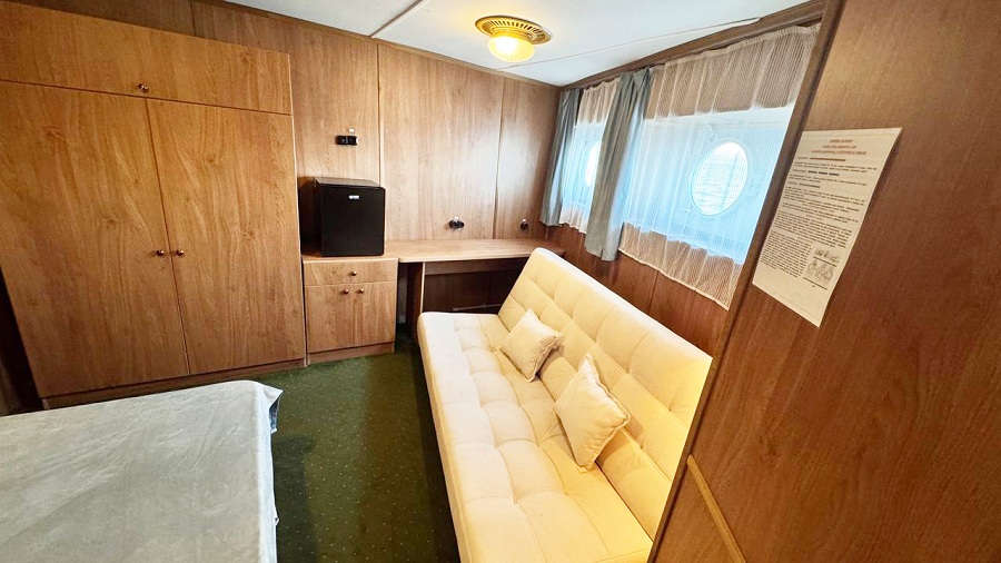 | Главная палуба | Полулюкс (2+1) К категории Полулюкс (2+1) относятся каюты: 19, 20.Двухместные каюты со всеми удобствами, расположенные на главной палубе.Площадь каюты от 12 м² до 13 м². Возможно размещение третьего человека на дополнительном спальном месте – диван. В каюте: двуспальная кровать, ванная комната (раковина, душ, туалет), холодильник, кондиционирование, шкаф для одежды, диван, телевизор, радио, розетка 220V, иллюминаторы. | 3-местное размещение | нет |