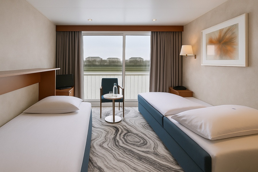 | Upper deck (верхняя палуба) | DOUBLE A К категории DOUBLE A относятся каюты: 305-340.Двухместная каюта, расположенная на верхней палубе.Площадь каюты ≈ 12 м². В каютах 305-334 – одна двуспальная кровать. В каютах 335-340 – две односпальные кровати. В каюте: одна двуспальная или две односпальные кровати, ванная комната (раковина, душ, туалет), комплект полотенец, фен, шкаф для одежды, холодильник, спутниковое телевидение, телефон внутренней связи, радио, сейф, кондиционер, стеклянная балконная дверь, французский балкон. | 2-местное размещение | ✔ |